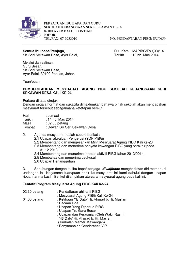 Surat Jemputan Ibu Bapa Mesyuarat Pibg 2015. Contoh surat surat panggilan adalah sebuah bentuk surat yang isinya berupa sebuah panggilan terhadap seseorang lembaga instansi untuk berkenan hadir ke tempat yang telah ditetapkan dalam isi surat. Contoh Surat Rasmi Tidak Hadir Bimbang Penularan COVID-19.